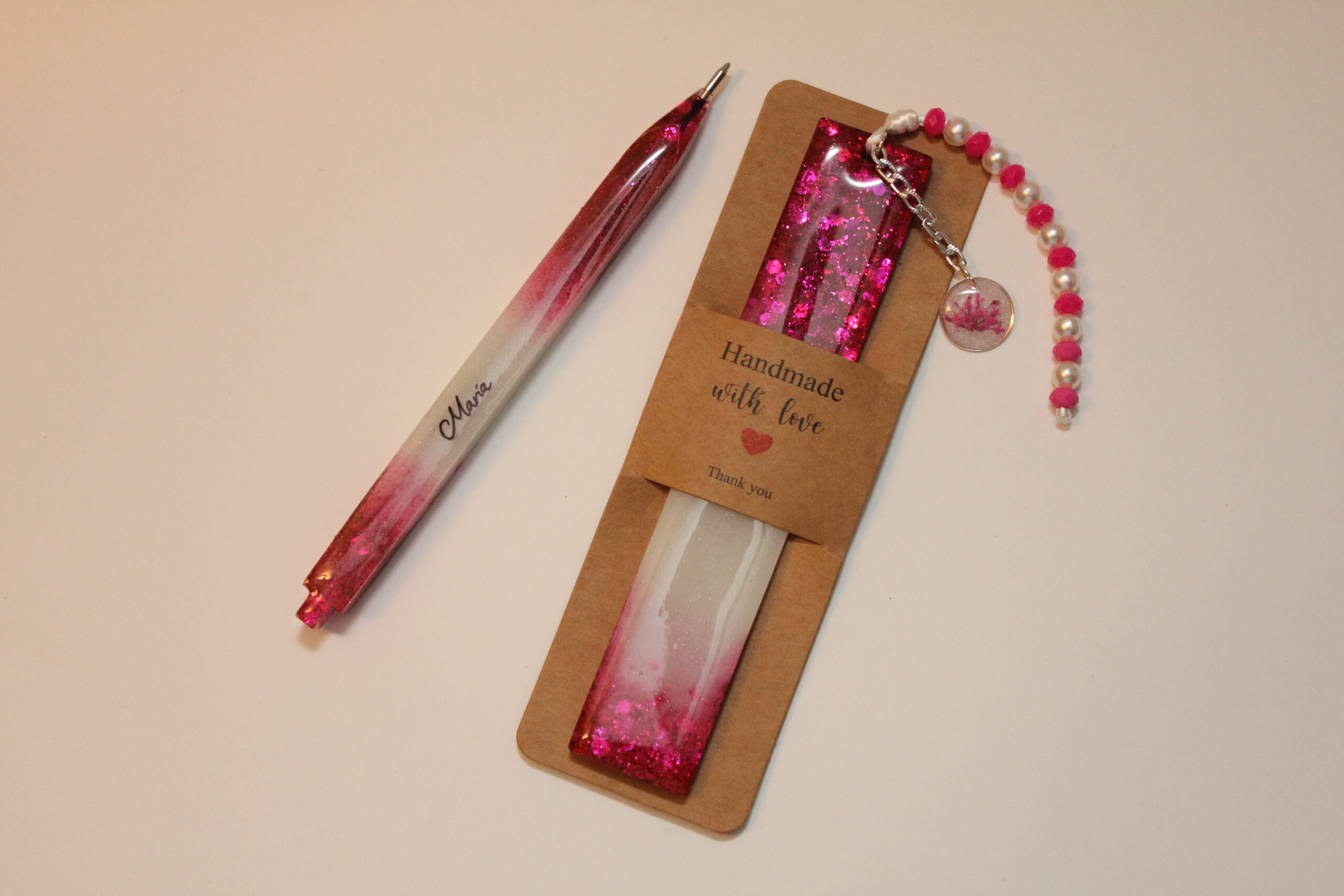 Marcapáginas y boligrafo artesanales, hechos con resina y toques de glitter, además de divertidas cuentas y un charm que encapsula una flor en su interior, un conjunto original perfecto para regalar.
