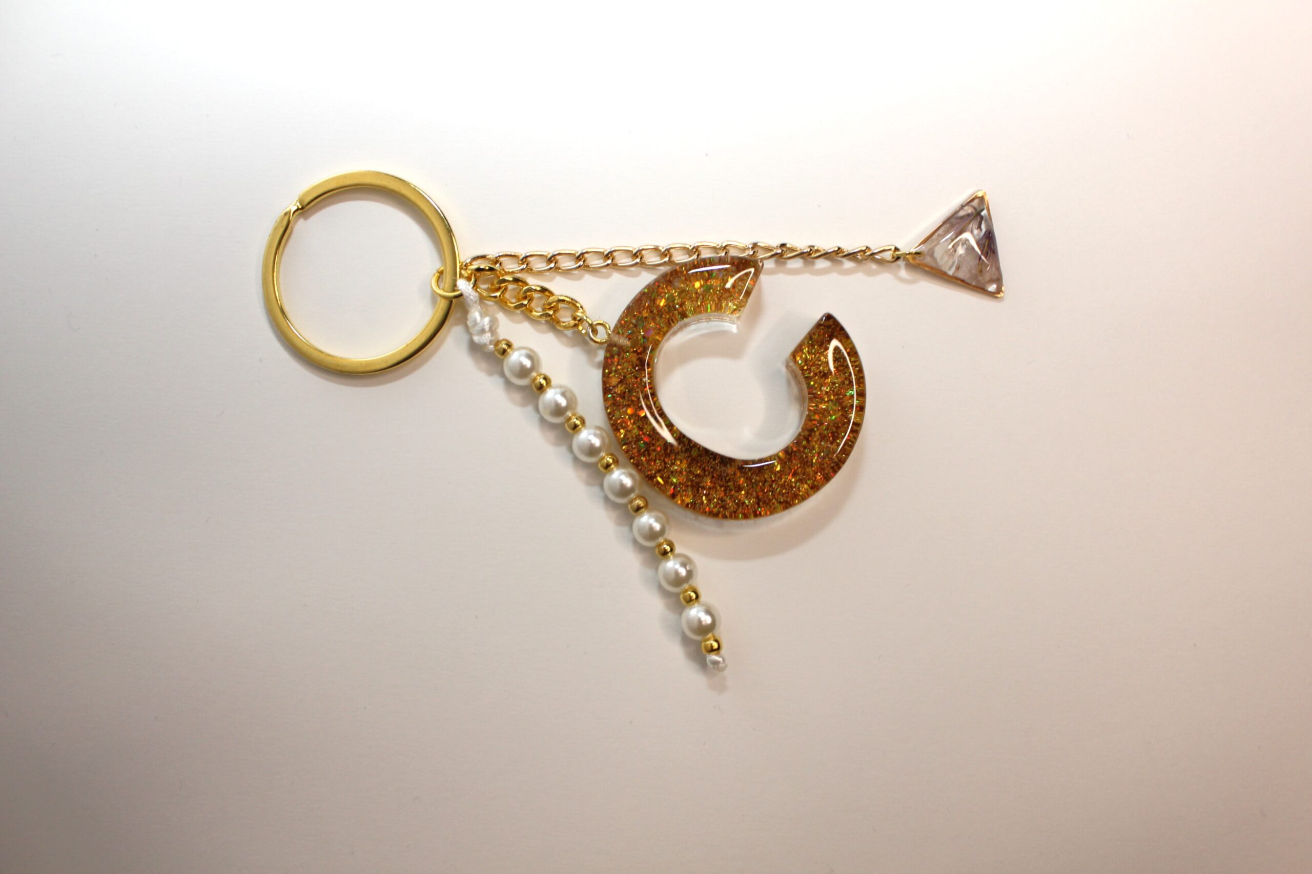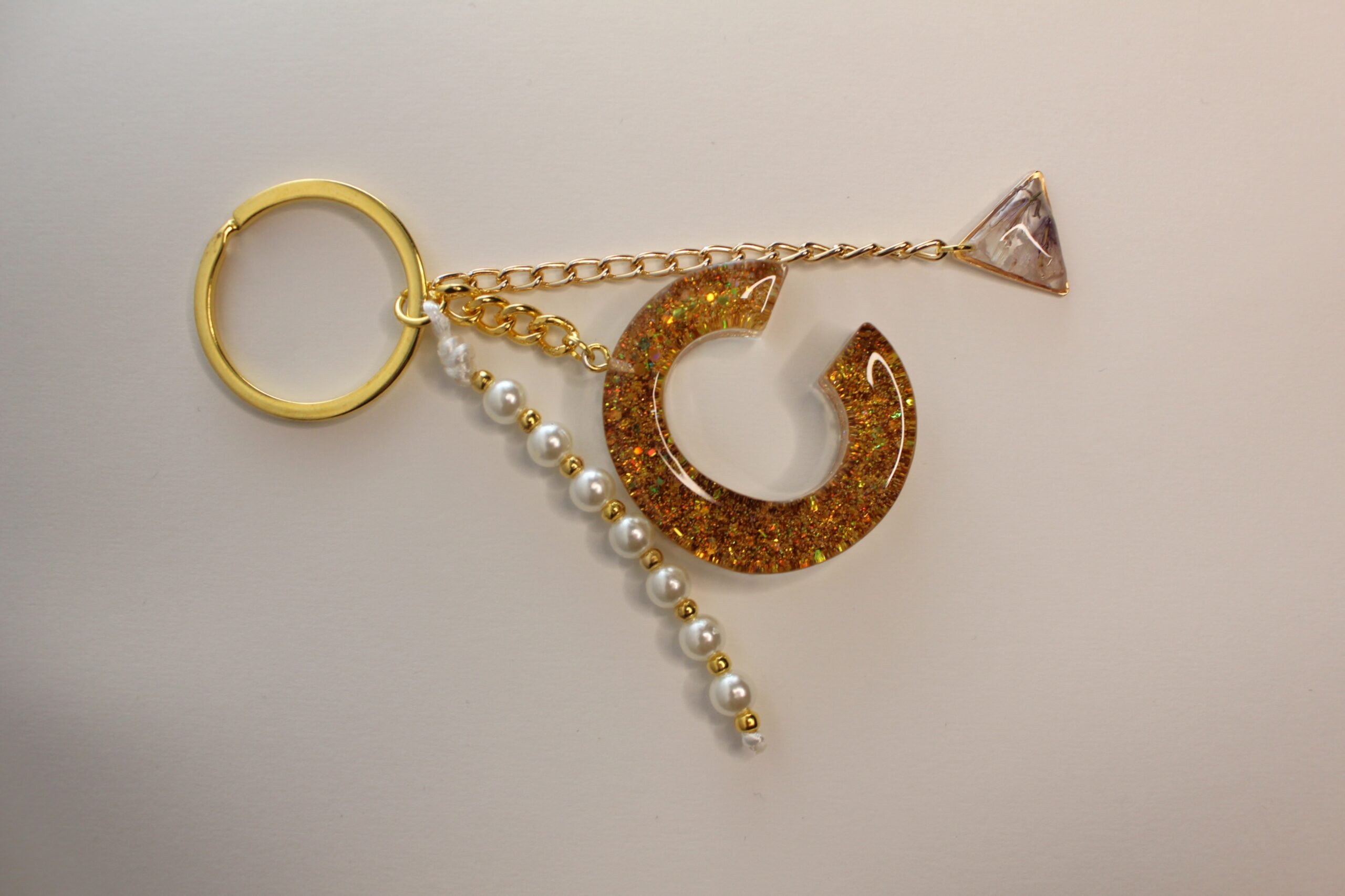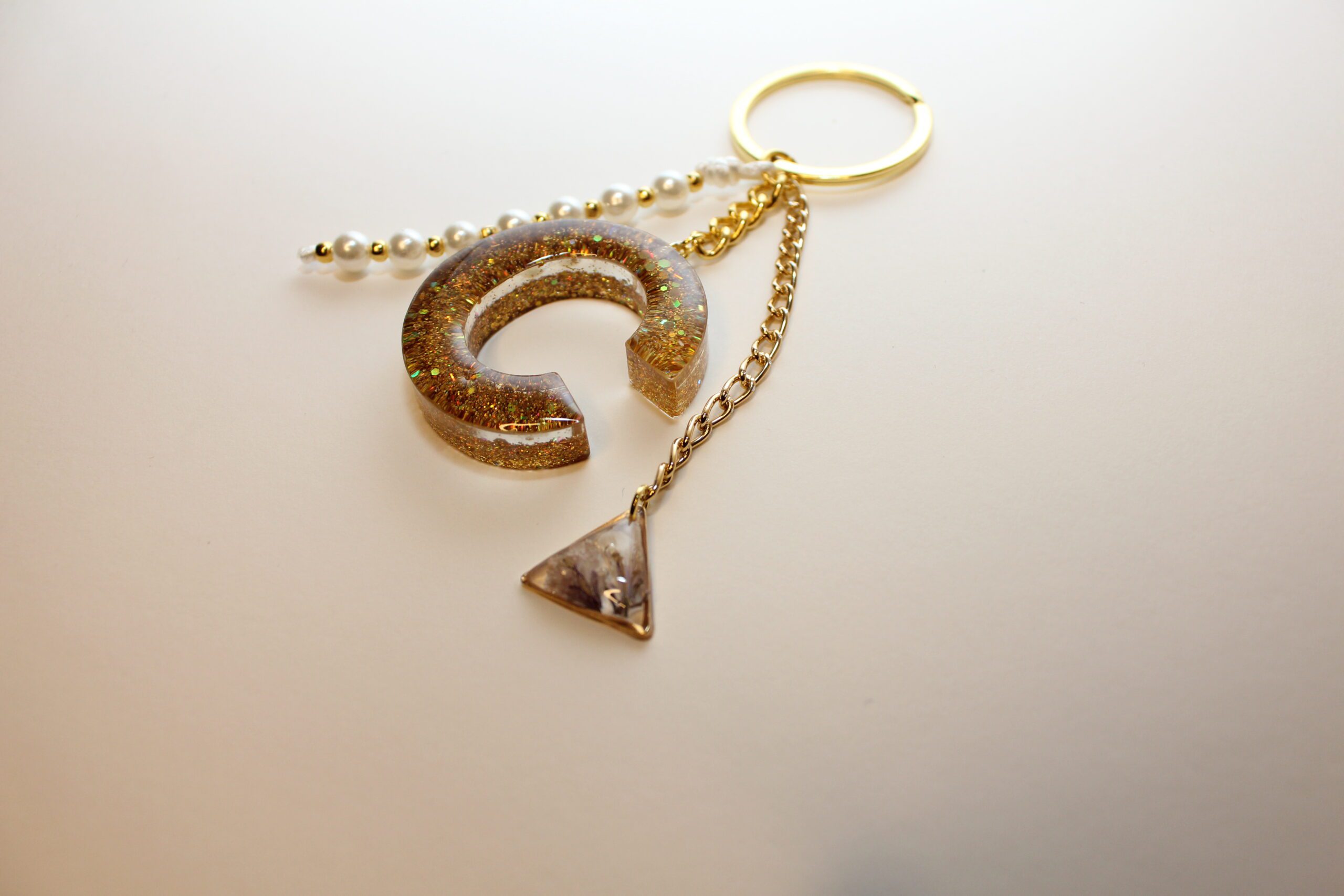 Llavero artesanal que deslumbra por su elegancia y calidez. La inicial en resina con destellos dorados captura la luz con un brillo sofisticado, mientras las delicadas perlas y el charm geométrico con flor natural aportan un toque romántico.