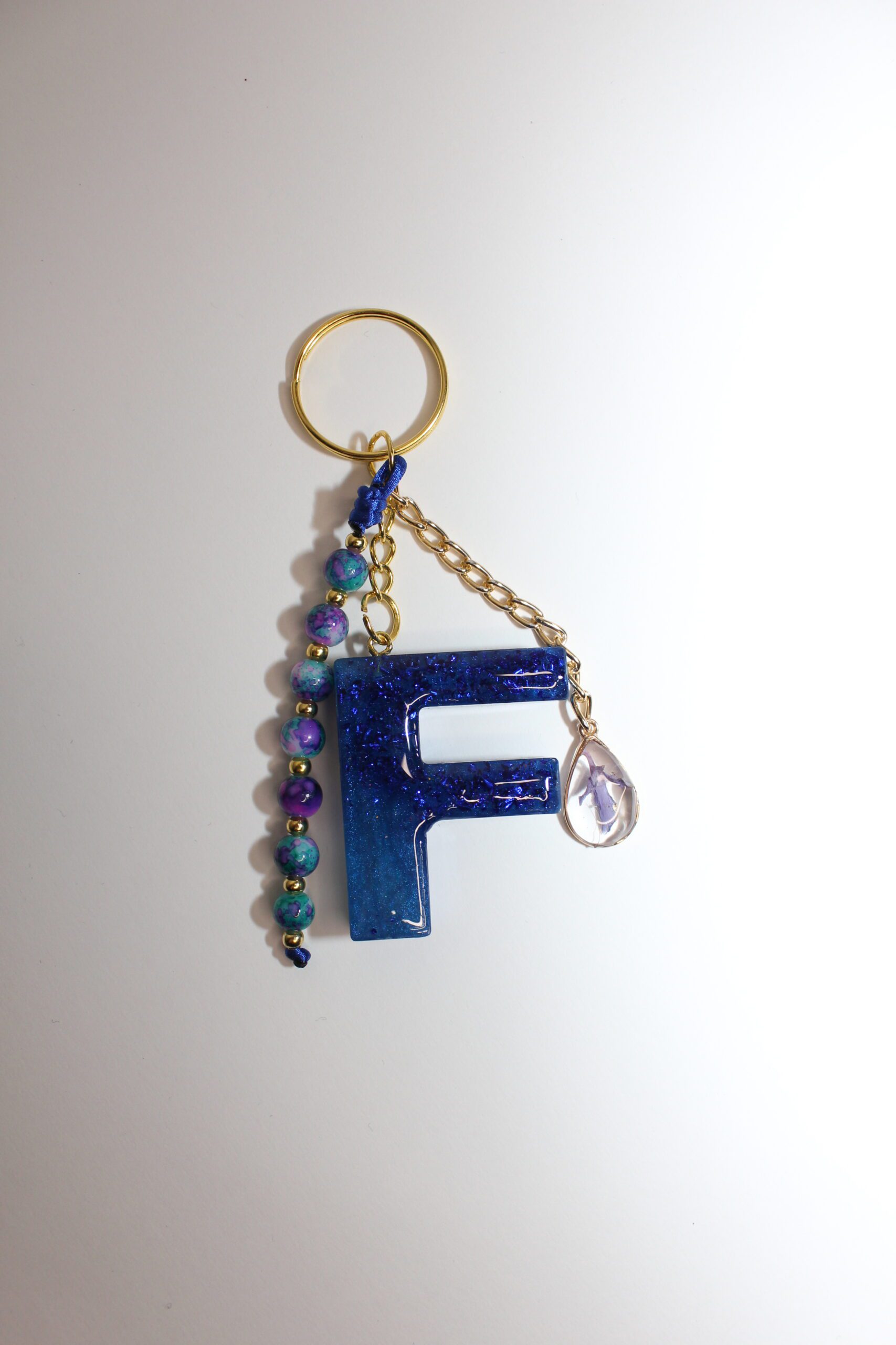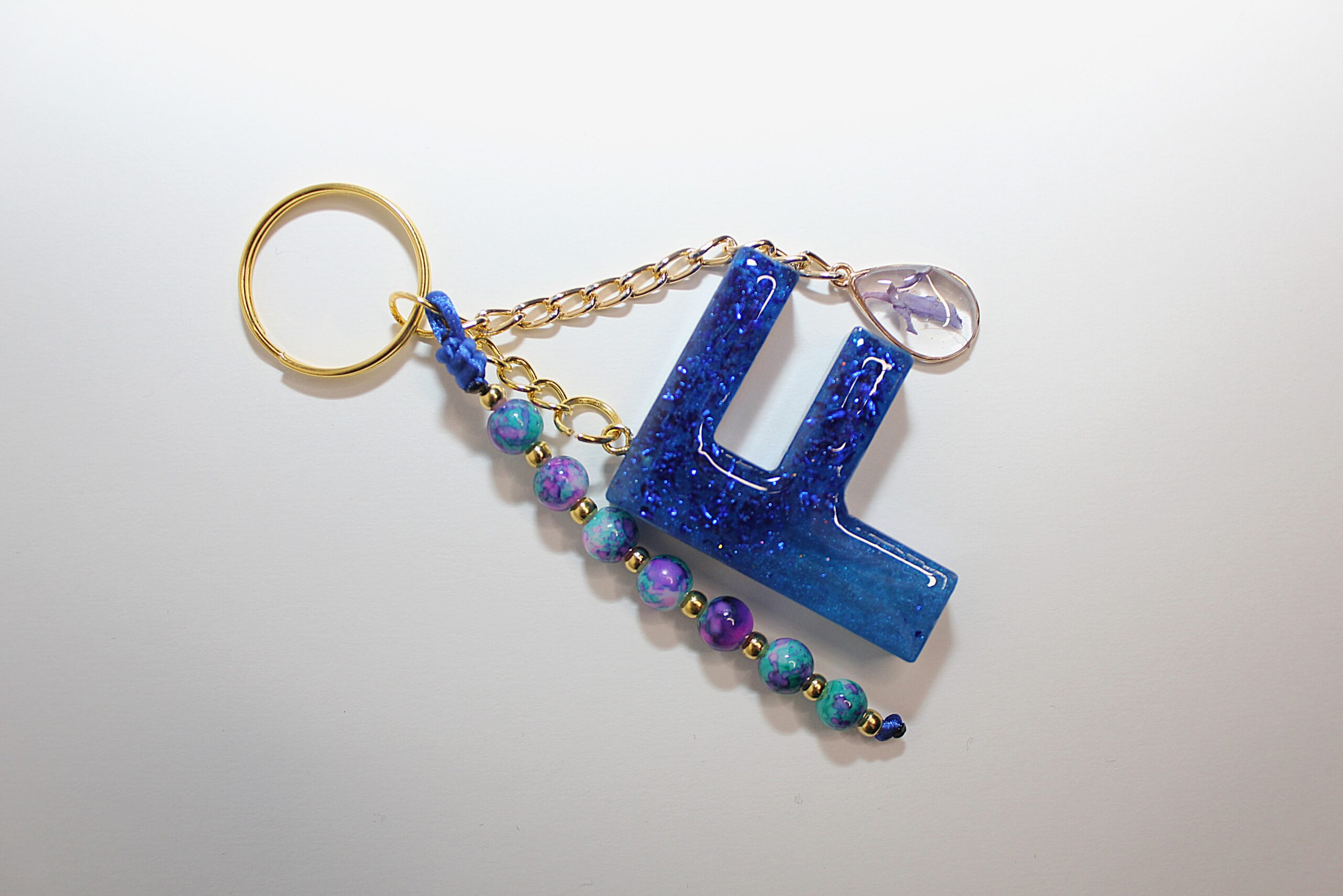 Llavero artesanal que combina elegancia y carácter.La inicial en resina azul profundo, sutilmente iluminada con destellos brillantes, se acompaña de delicadas cuentas en tonos iridiscentes y un charm en forma de gota que resguarda una flor natural.