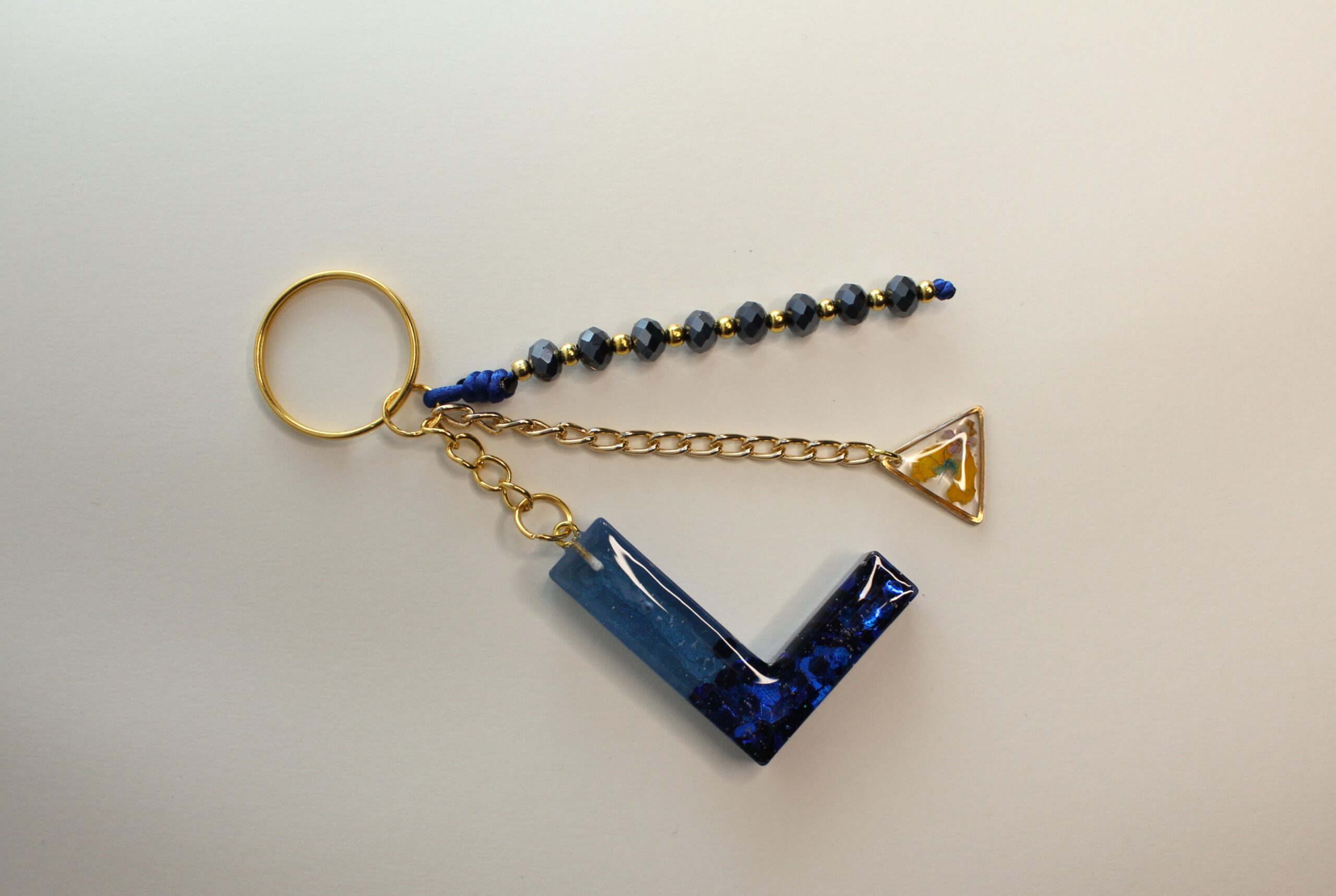 Llavero artesanal elaborado en resina, donde el azul intenso y el brillo destacan en la inicial, acompañada de delicadas cuentas , creando un contraste elegante y sofisticado. Con detalle de un charm triangular con petalos encapsulados.