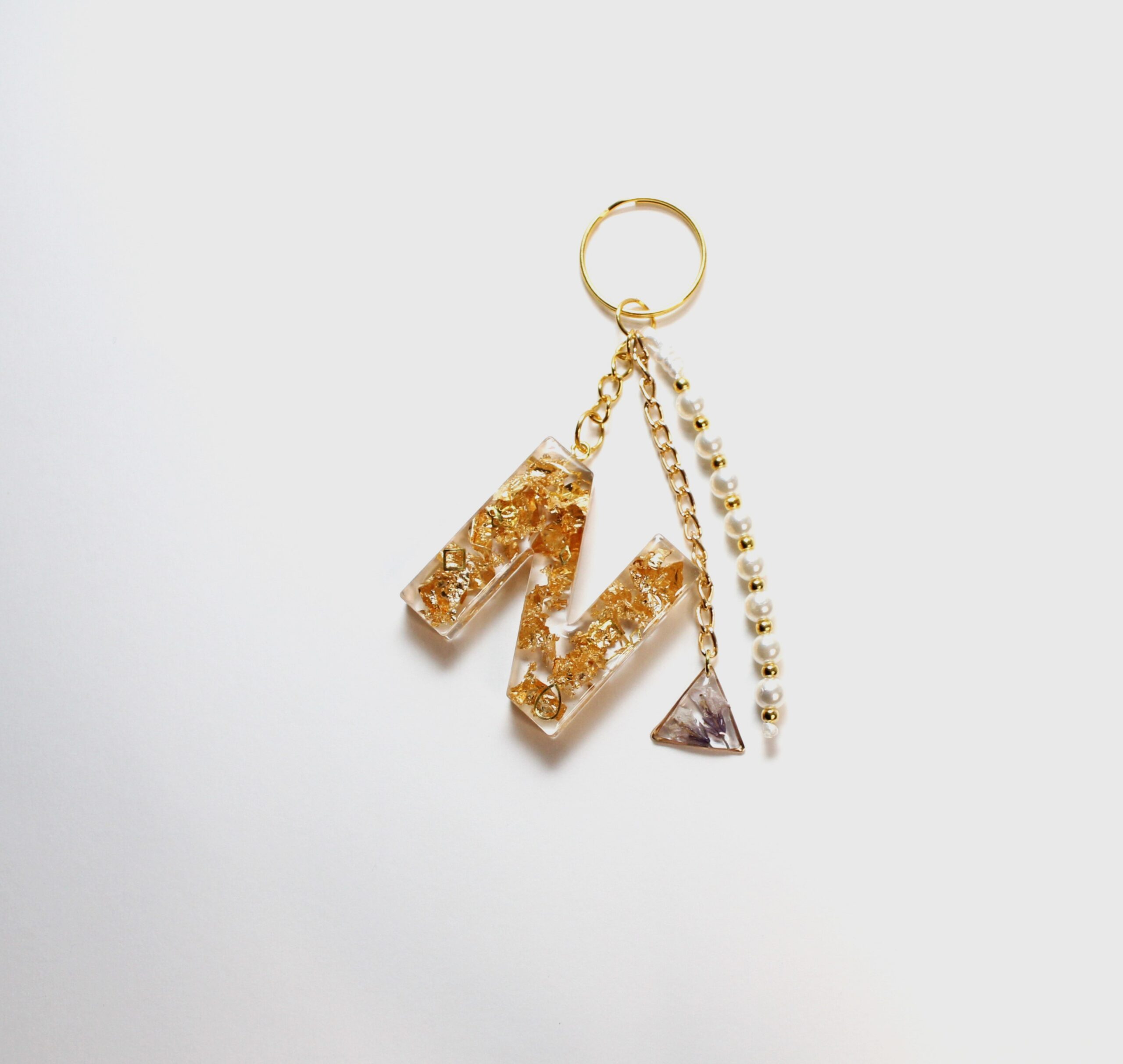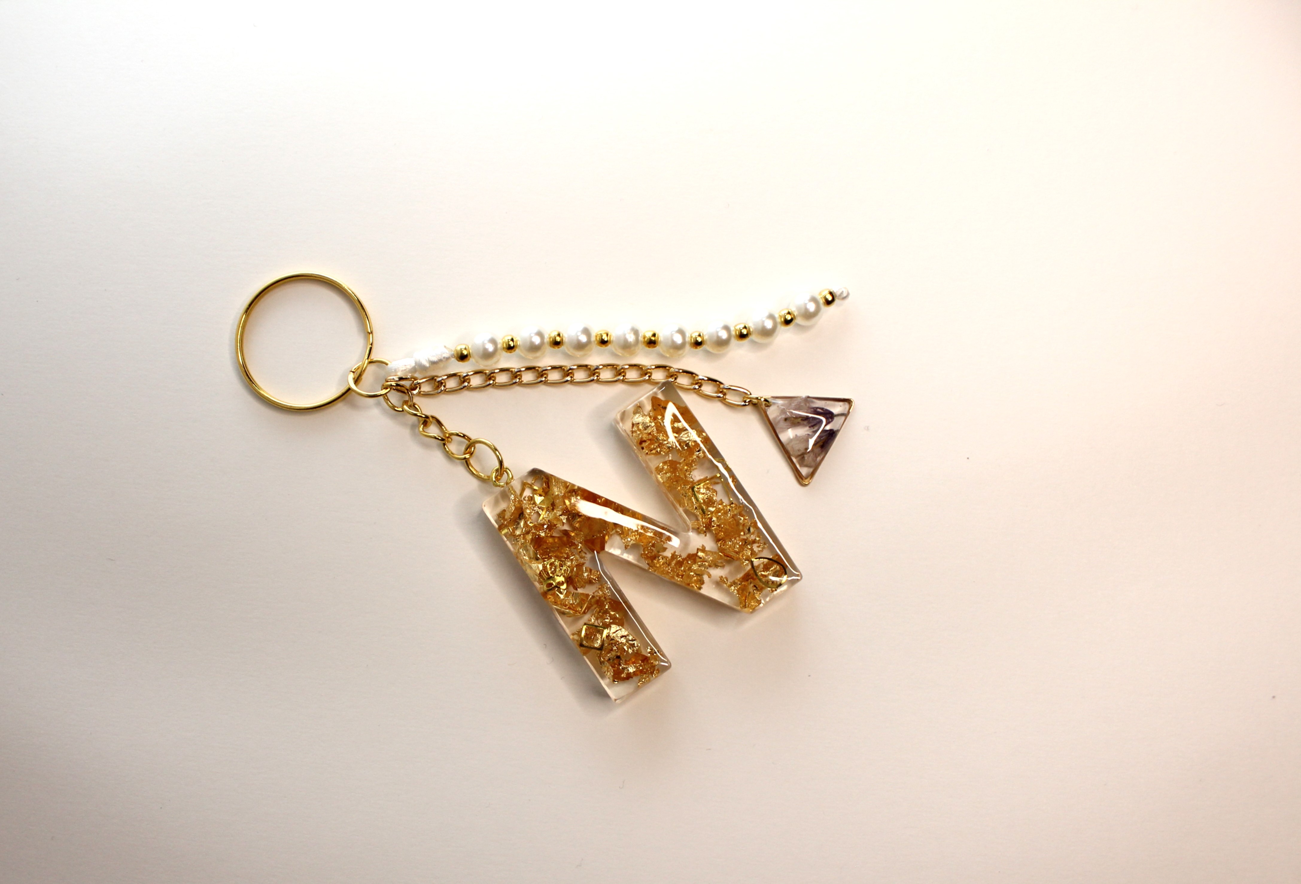 Llavero artesanal en resina transparente con destellos dorados que aportan luz y elegancia. La inicial está acompañada de perlas, que realzan su diseño, además de un detalle en forma de triangulo con flores naturales encapsuladas.