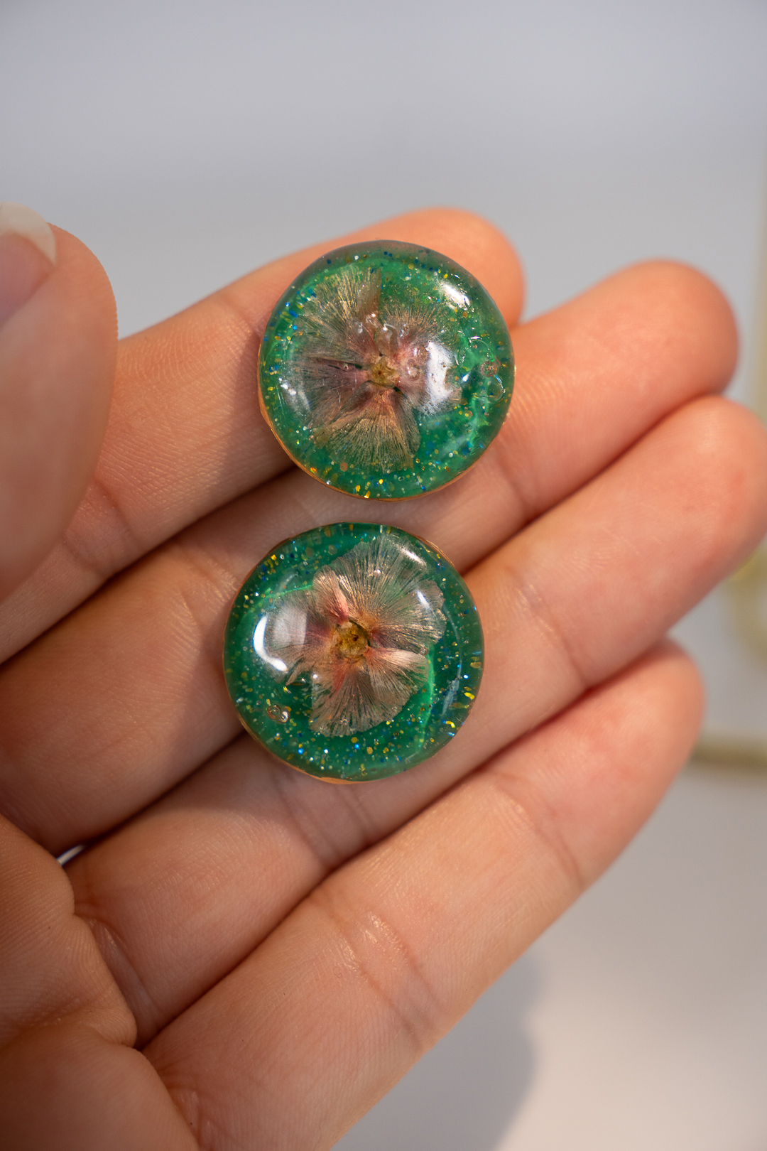 Pendientes artesanales de resina, hechos a mano con flor natural encapsulada y delicados destellos luminosos. Naturaleza y elegancia en perfecta armonía.