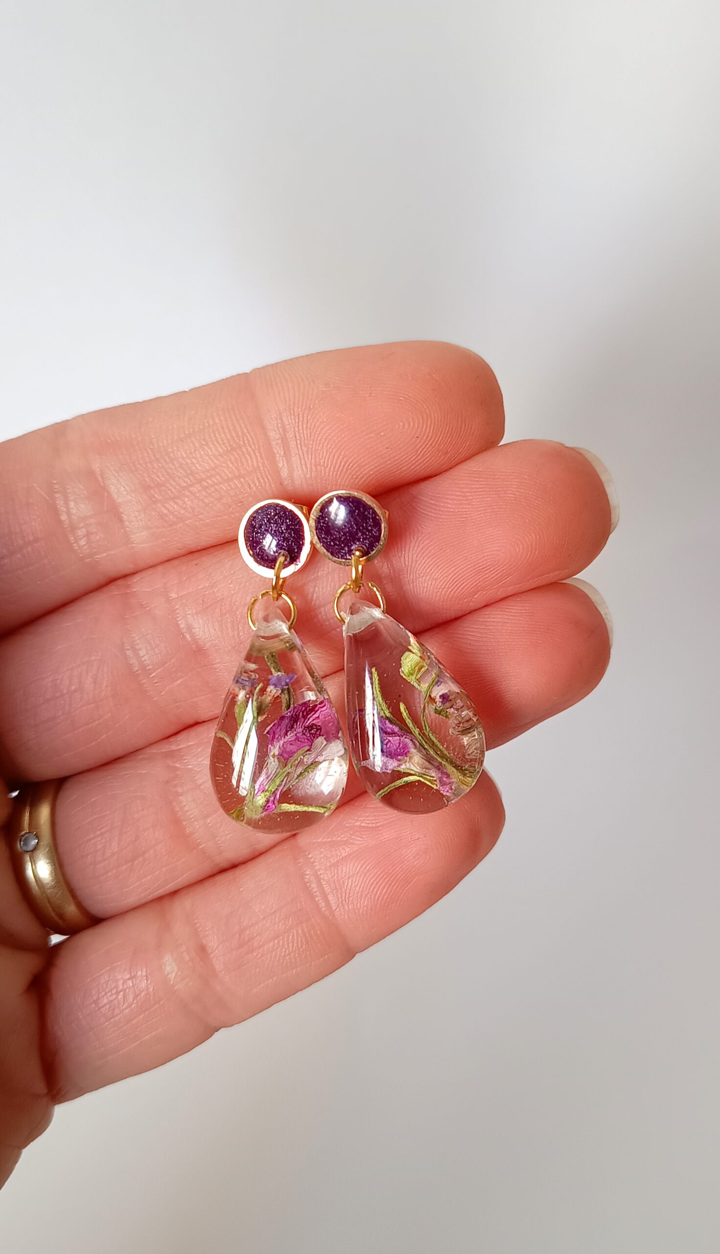 Pendientes artesanales de resina, y acero inoxidable elaborados a mano con flores naturales encapsuladas. Delicados, luminosos y sutilmente elegantes.