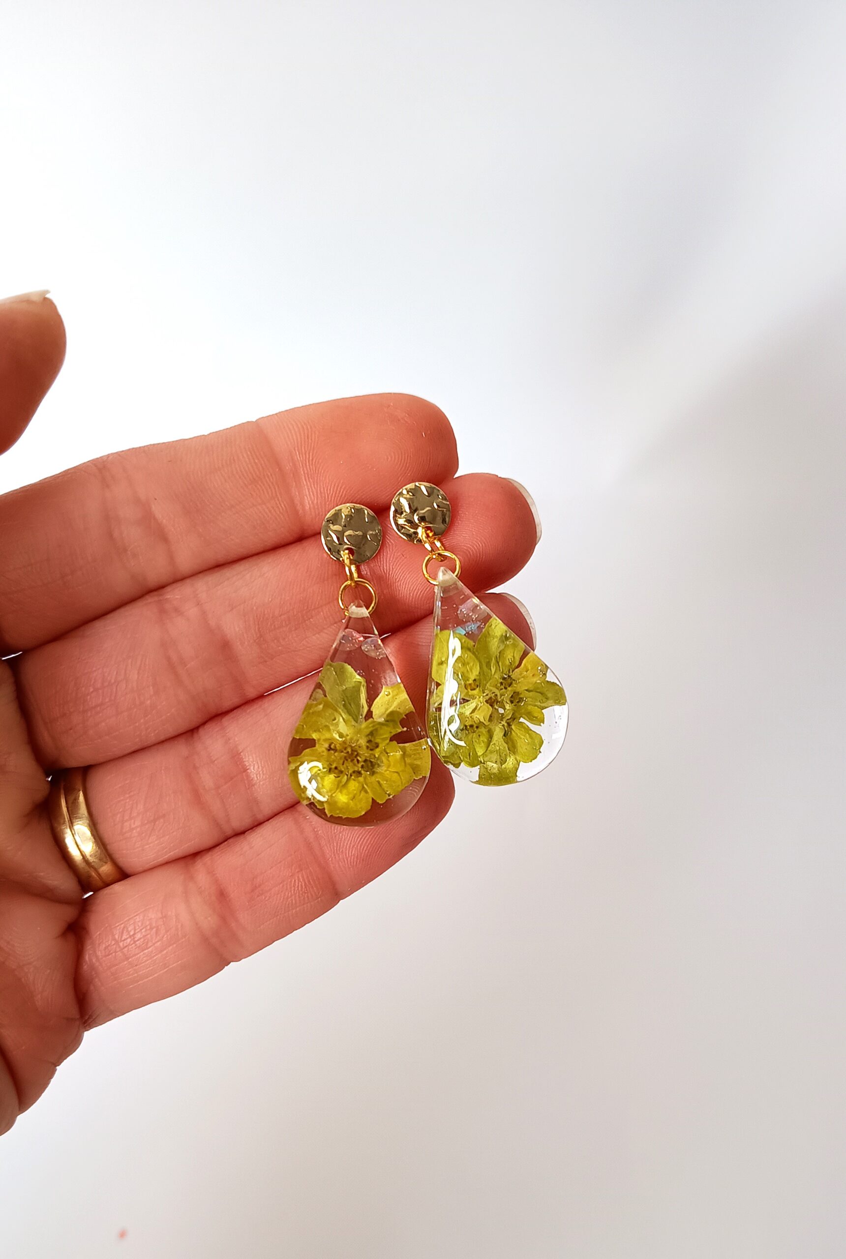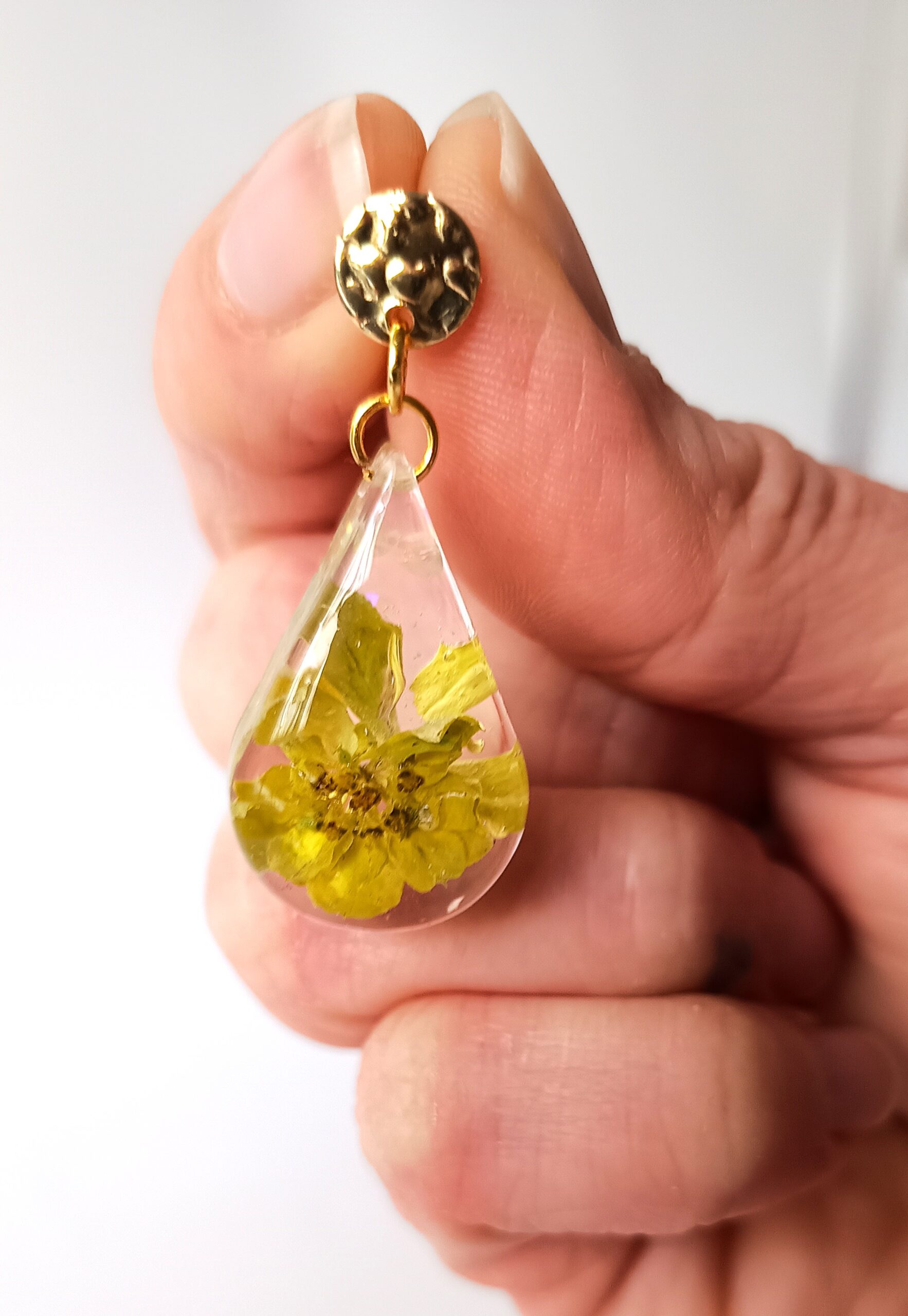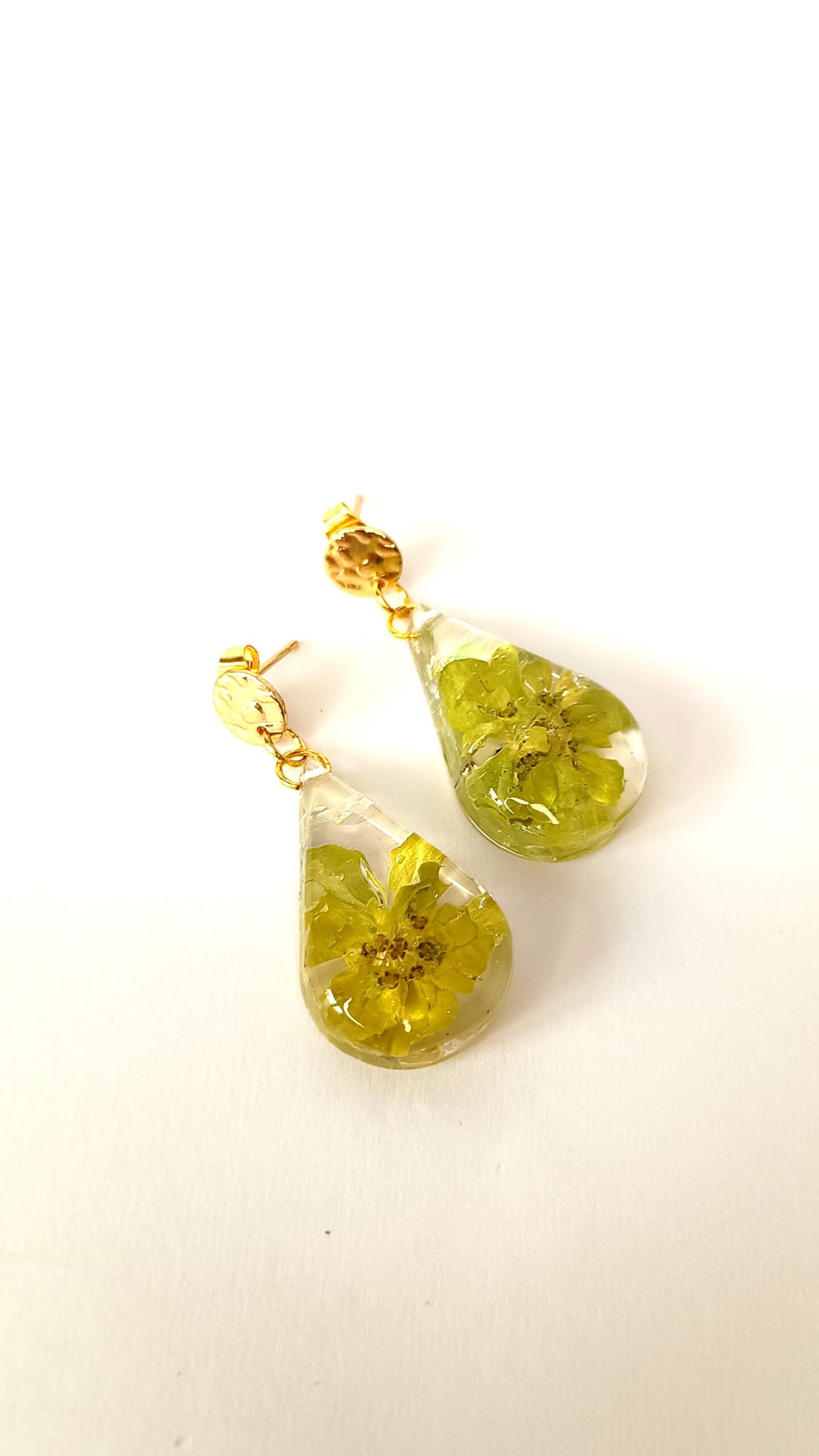 Pendientes de resina y acero inoxidable, hechos a mano con forma de gota que contiene encapsulada en su interior una flor silvestre color verde y cierre dorado de mariposa.