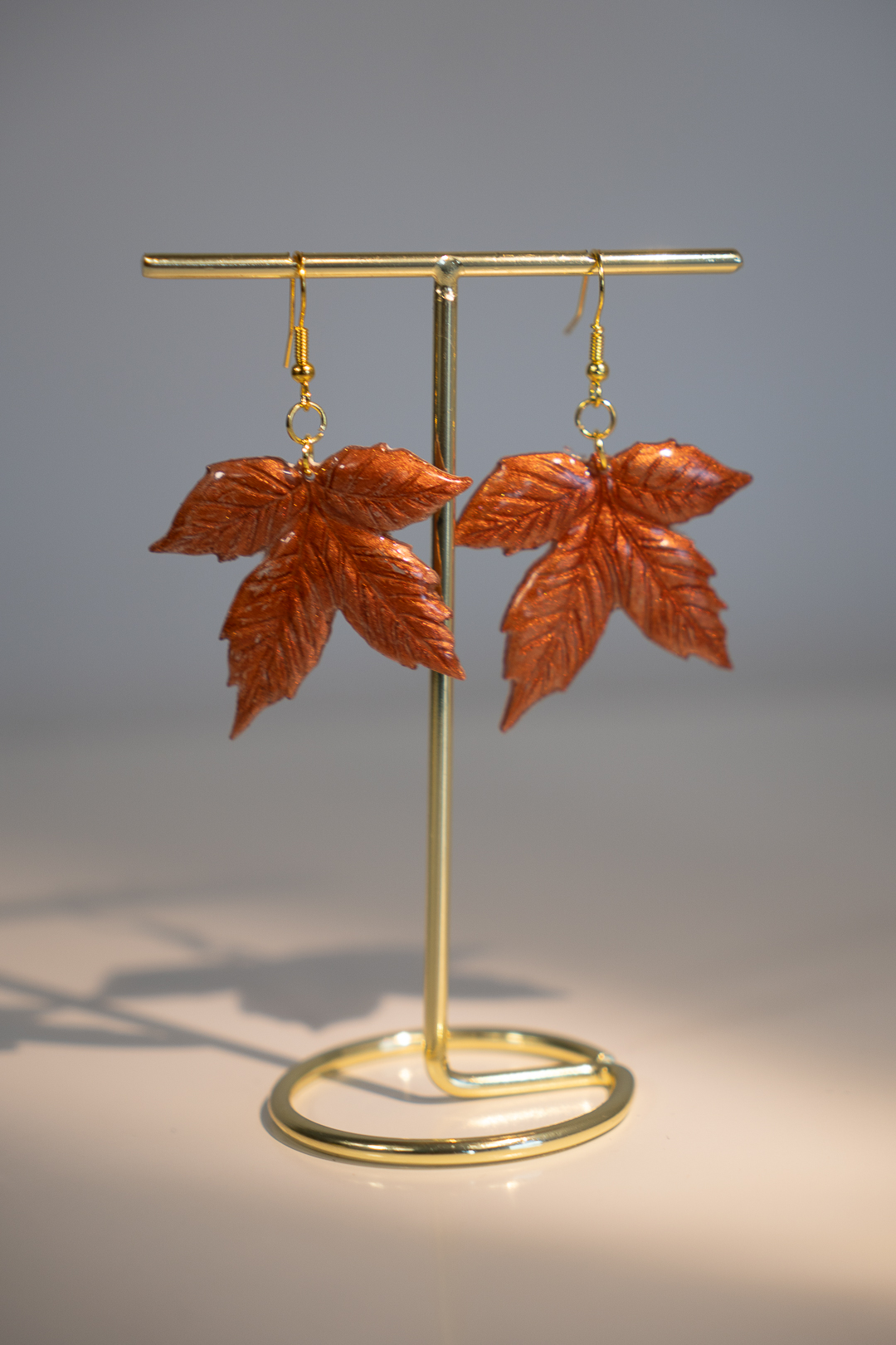 Pendientes de resina, hechos a mano con forma de hoja de otoño, color teja con pigmentos metalizados.