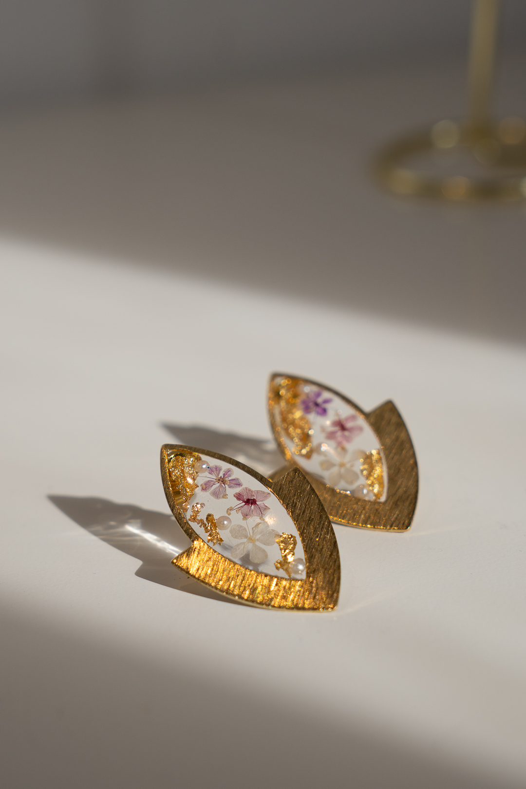 Pendientes de resina y acero inoxidable, hechos a mano, con pequeñas flores coloridas y detalles dorados en su interior sobre un original fondo transparente.