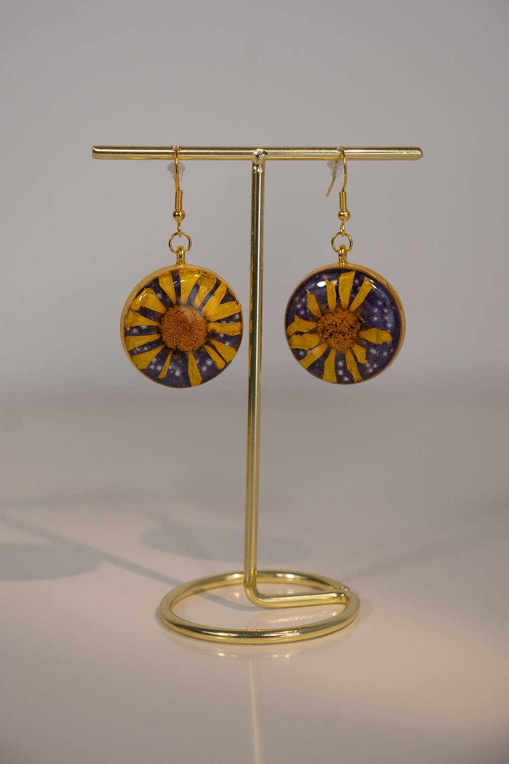 Pendientes de resina y acero inoxidable, hechos a manos, con una margarita natural encapsulada en su interior sobre un fondo morado , adornado con pequeñas esferas de cristal.