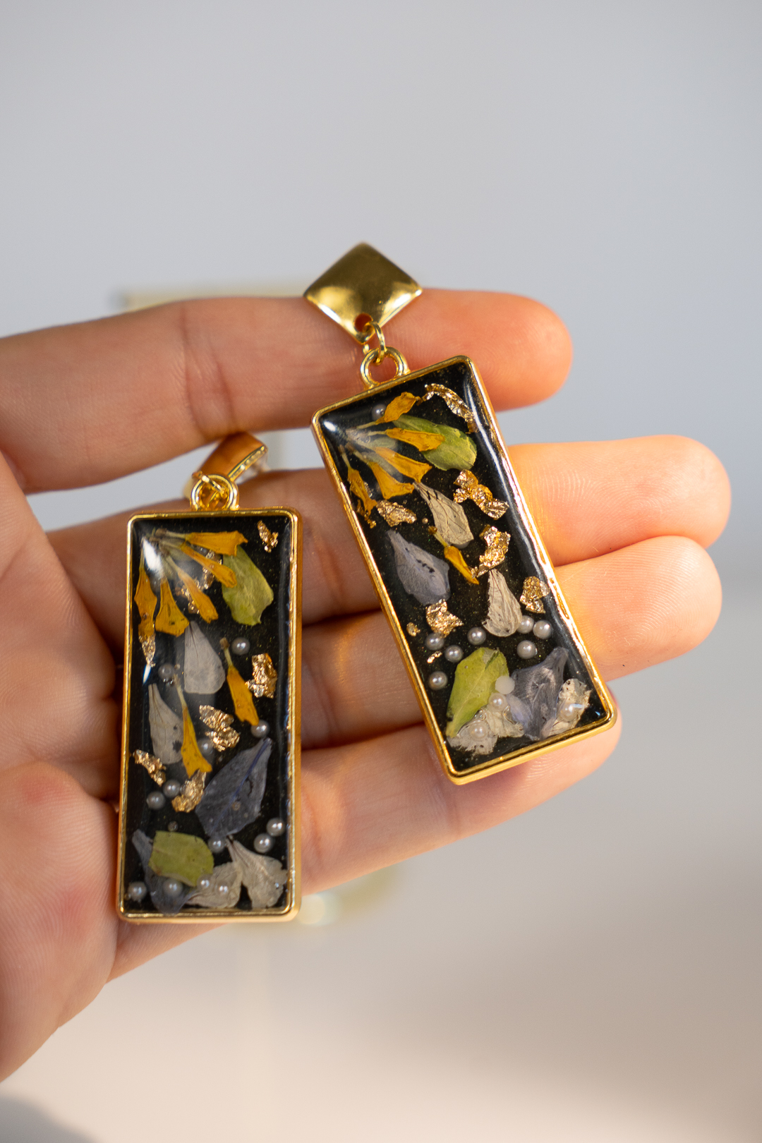 Pendientes de resina y acero inoxidable, hechos a mano con pétalos de diferentes colores, decorados con perlas y unos toques de dorado, sobre un fondo negro que hace que sus colores resalten.