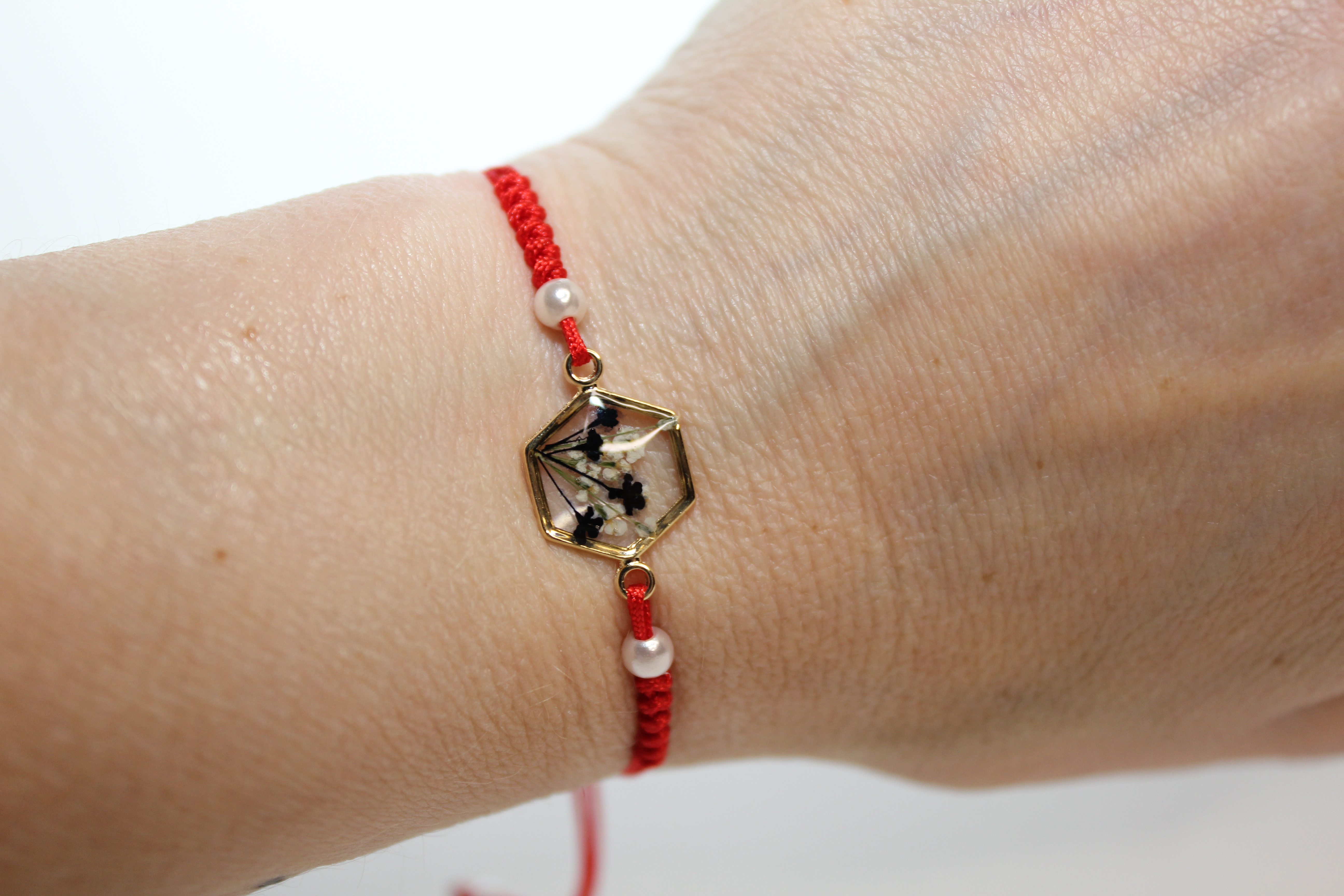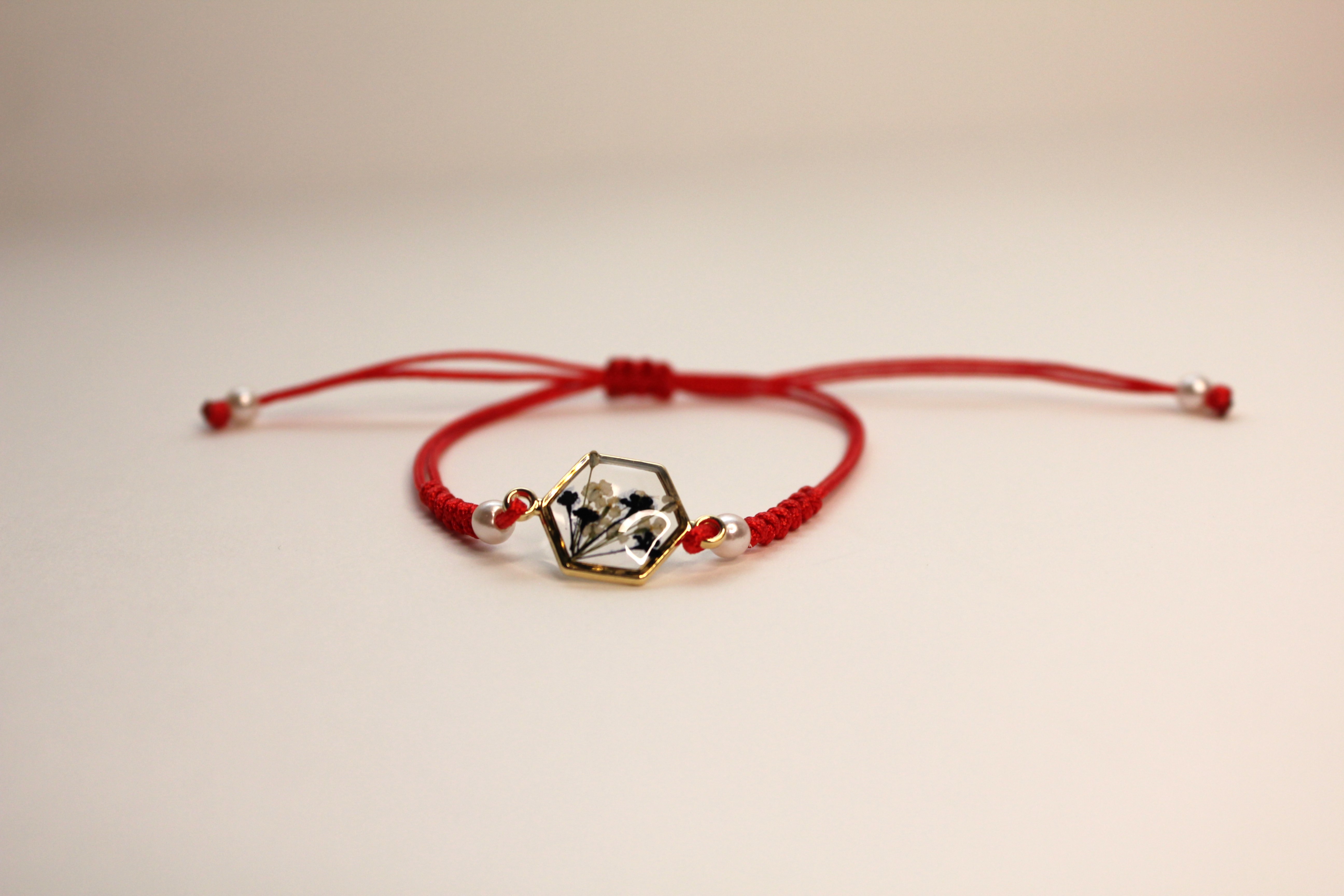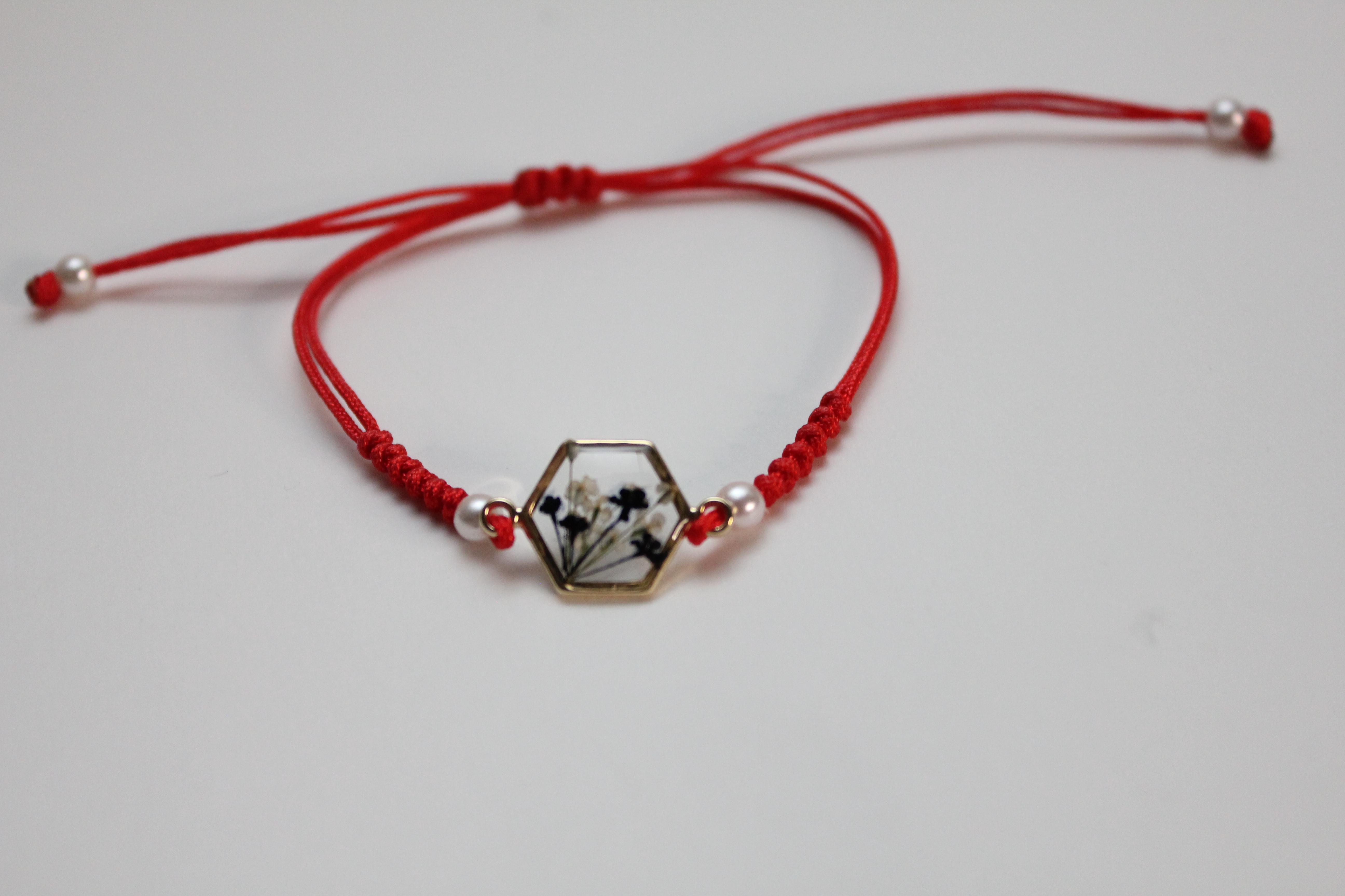 Pulsera artesanal elaborada con hilo de nylon rojo y charm en acero inoxidable y resina con flores encapsuladas tonos blanco y negro, ademas de unas delicadas perlas.